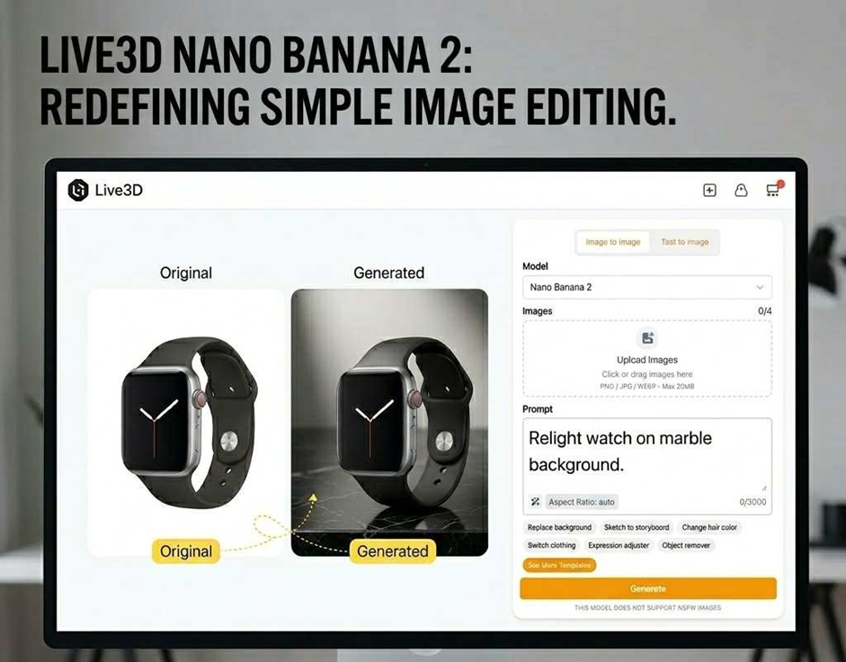 Taking professional product photos used to require expensive lighting setups and hours of post-processing. With this tool, you can take a simple photo of a product on a kitchen table and transform it into a high-end studio shot. By describing a “minimalist marble background with soft cinematic lighting,” the AI regenerates the environment while keeping the product’s integrity intact.